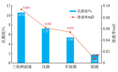 3 储层主控因素 3.1 沉积作用对储层物性的影响吉木萨尔凹陷芦草沟组沉积相主体为湖相和三角洲相[8, 16](图 5)。不同的沉积相对应不同的岩性和物性(图 6)。①在凹陷边缘地带,主要分布三角洲前缘相,以粉细砂岩为主,因其近物源、杂基含量高、分选性差,大部分孔隙以原生粒间孔和剩余粒间孔为主,长石等不稳定矿物组分较多,常被酸性流体溶蚀形成溶蚀孔,物性好,孔隙度平均为10.58%,渗透率平均为0.094 mD,是最为有利的储层;②向凹陷中部地区转变为浅湖相,泥质细粒沉积物增多,整体物性不及边缘地带,但在碱性环境下浅湖中的云屑砂岩、云岩等粒间溶孔较为发育,同时长石等也会发生溶蚀而改善储层物性条件,使得浅湖相孔渗条件仅次于三角洲前缘相,平均孔隙度为7.25%,渗透率平均为0.062 mD。③半深湖相以泥质粉砂岩、粉砂质泥岩、泥岩为主,孔渗条件相对较差,孔隙度平均为5.4%,渗透率平均为0.054 mD。深湖相多以泥岩为主,孔渗条件差,孔隙度平均为1.8%,渗透率平均为0.006 5 mD。