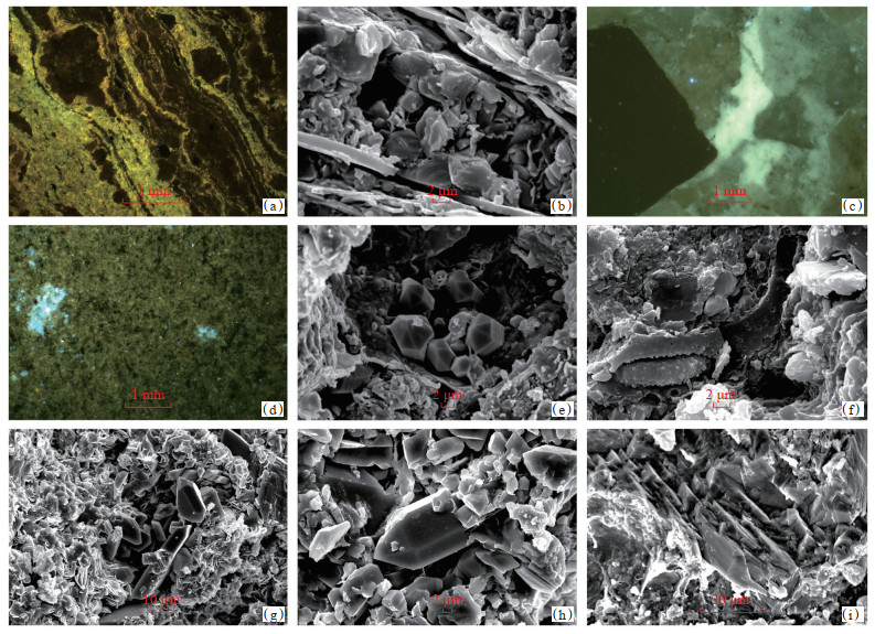 下载原图 图 7 吉木萨尔凹陷芦草沟组储层成岩作用 (a)炭质、有机质顺层呈定向分布,J174井,3 161.75 m,含云质陆屑砂屑泥晶灰岩;(b)伊/蒙混层矿物与片状伊利石定向排列,J30井,4 048.35 m,灰质泥岩;(c)方解石胶结物呈斑块状分布,J115井,1 345.65 m,砂砾岩;(d)少量菱铁矿团粒,溶蚀孔中半—全充填方解石和铁白云石,J32井,3 566.69 m,粉砂质泥岩;(e)黏土矿物主要见有粒间充填的书页状、蠕虫状高岭石,J001井,1 662.07 m,砂砾岩;(f)定向片状伊利石与方解石晶粒,J30井,4 056.02 m,白云质灰岩;(g)石英次生加大现象明显,J172井,2 927.9 m,灰质粉砂岩;(h)溶蚀孔中充填的沸石类矿物与粒状石英,J174井,3 275.43 m,灰质粉砂岩;(i)长石碎屑的溶蚀现象与钙质球粒,J15井,2 283.56 m,亮晶鲕粒砂屑灰岩 Fig. 7 Diagenesis characteristics of Lucaogou Formation in Jimsar Sag |