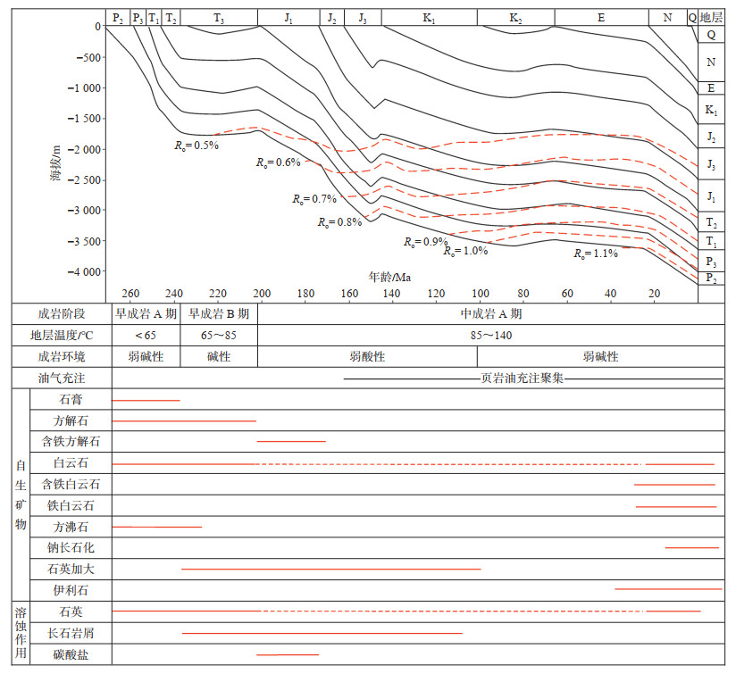 3.2.4 成岩阶段划分根据王剑等[28]的研究结果,结合镜下矿物分布及演化特征、溶蚀作用、颗粒接触关系、孔隙类型、有机质成熟度等,依据石油天然气行业标准[21],对吉木萨尔凹陷芦草沟组成岩阶段进行划分(图 9)。镜下薄片鉴定显示,芦草沟组砂岩颗粒间接触方式以点—线接触为主,在扫描电镜下可见石英次生加大,可观察到自生石英晶体,部分长石溶蚀且向钠长石转化;全岩分析显示黏土矿物以伊利石、绿泥石、伊/蒙混层为主,高岭石含量较低,镜质体反射率(Ro)为0.60~1.08。综合以上各种指标,可判断吉木萨尔凹陷芦草沟组砂岩普遍进入中成岩阶段A期。