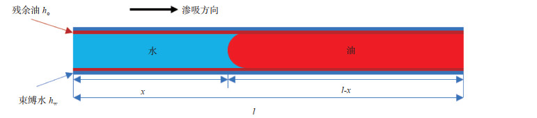 1 自发渗吸驱油数学模型假设致密砂岩基质孔隙由大量毛管束组成,在渗吸过程中,忽略重力影响,在毛管力的作用下,水自发驱替原油。假设毛管的长度为l,半径为r,t时刻油水界面的位移距离为x,束缚水与残余油分别以水膜、油膜形式存在,厚度分别为hw、ho(图 1),不同毛管半径中水膜、油膜厚度占比相同,则毛管渗流有效半径计算公式为[24]