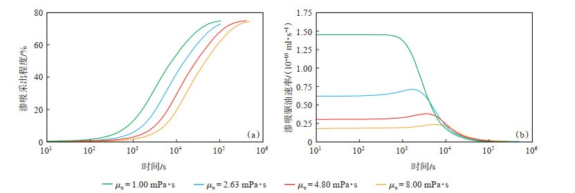 保持水黏度不变,随着原油黏度从1 mPa·s增加至8 mPa·s,在相同时间内,渗吸采出程度[图 10(a)]及渗吸驱油速率[图 10(b)]均有着不同程度的下降。这是由于随着原油黏度的增加,黏滞阻力增大,从而使得原油渗吸驱油速率降低,渗吸采出程度下降。