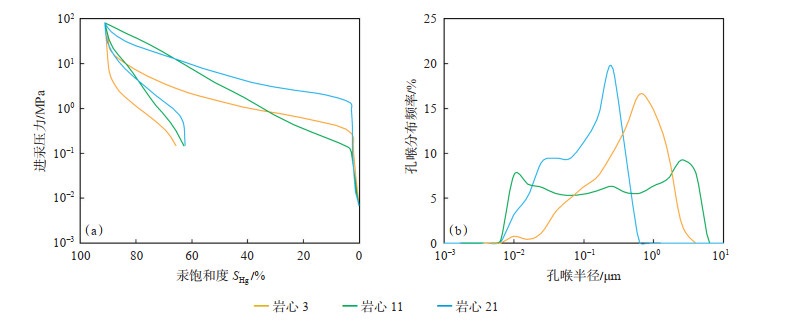 高压压汞法是测量岩心孔隙结构最常见的方法。Wang等[26]利用高压压汞测试对鄂尔多斯盆地延长组致密砂岩孔隙分布及分形特征进行研究,选取了其中3块致密砂岩进行渗吸模拟实验,其岩心毛管力曲线、孔喉分布频率如图 2所示,高压压汞部分岩心参数如表 1所列。岩心11气测渗透率最高,为2.290 mD,孔喉分布范围广泛,岩心最大孔喉半径、平均孔喉半径及孔喉半径中值均偏大;岩心21渗透率最小,为0.104 mD,孔喉半径集中分布于0.1 μm左右,且岩心分选系数最小;岩心3渗透率介于两者之间,孔喉半径集中分布在1.0 μm左右,且大孔喉所占比例较大。结果表明:随岩心渗透率增加,最大孔喉半径增大,孔喉分布曲线向右移动。