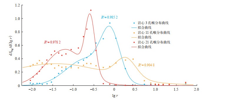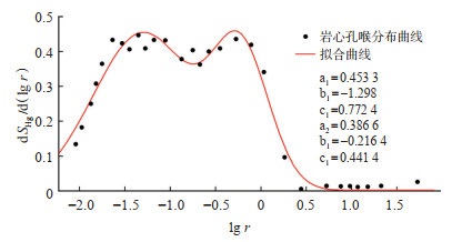 对岩心孔喉分布与岩心半径对数进行拟合,发现岩心孔喉分布频率dSHg/d(lg r)与孔喉半径对数lg r在半对数图上呈二维高斯分布(图 3)。二维高斯分布函数可表示为