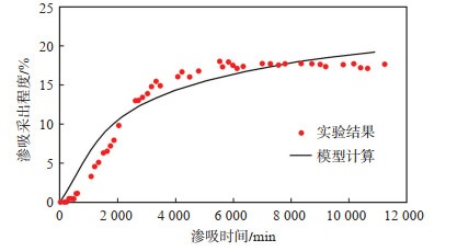 下载原图 图 6 模型计算得到的渗吸采出程度与实验测得渗吸采出程度对比 Fig. 6 Comparison of oil recovery degree by spontaneous imbibition derived from mathematical model and experiment |