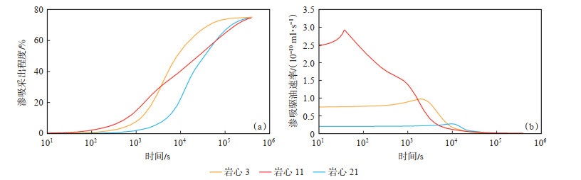 分别对鄂尔多斯盆地延长组岩心3、岩心11、岩心21(参见表 1)进行渗吸模拟计算,得到渗吸采出程度与渗吸驱油速率随时间的变化曲线(图 7)。由于各岩心孔喉分布不同,渗吸采出程度及渗吸驱油速率也不同。岩心11大孔喉比例大,渗透率高,因此,初始渗吸驱油速率及渗吸采出程度最高。随着渗吸时间增加,渗吸驱油速率开始降低,并在渗吸约3 000 s后,岩心11渗吸采出程度小于岩心3。分析认为岩心3孔喉分布较为集中,其渗吸驱油速率在较长时间内比较稳定。岩心21始终保持较低的渗吸驱油速率,是由于其孔喉半径较小。同时,渗吸足够长时间后,岩心21的渗吸采出程度大于岩心11,从其孔喉分布图(参见图 2)中可以发现,岩心11小孔喉半径所占的比例大于岩心21。因此,可以推断岩心孔喉半径分布对岩心的渗吸驱油速率及渗吸采出程度有着一定的影响。对比各岩心孔隙分布与其渗吸驱油速率发现,在渗吸前期,半径较大的孔喉对岩心渗吸影响较大,随着岩心内孔喉半径及其占比的增大,岩心渗吸驱油速率及渗吸采出程度随之增大;在渗吸后期,半径较小的孔隙对岩心的渗吸影响较大,岩心渗吸驱油速率随岩心内小孔喉占比增大而减小。此外,岩心11渗吸驱油速率达到最大值后,渗吸驱油速率下降曲线并不光滑,渗吸驱油速率迅速下降后逐渐趋于平缓,但随后再次急剧下降(图 7)。分析认为岩心11孔喉分布范围广且不均匀,微纳米孔喉在各半径处均有着一定分布,因而渗吸驱油速率随孔喉分布变化而变化。