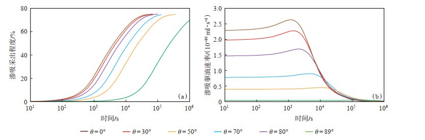 下载原图 图 8 不同润湿角下致密岩心渗吸采出程度及渗吸驱油速率 Fig. 8 Oil recovery degree and imbibition rate in tight sandstone core samples with different wetting angle |
