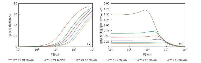 随油水界面张力增大,在相同时间内,渗吸采出程度及渗吸驱油速率均增大,且油水界面张力越大,开始产油时间越早,渗吸驱油速率到达最大值所需时间越短(图 9)。由于表面活性剂能够改变岩石表面润湿性,因此其常被用于提高致密油藏渗吸驱油效果。表面活性剂在改变岩石润湿性的同时,会降低油水界面张力。油水界面张力降低会提高原油流动性,有助于启动残余油。但当油水界面张力过低时,渗吸的动力毛管力也会大幅度降低,不利于渗吸驱油的进行。因此,在筛选渗吸用表面活性剂时,所选表面活性剂在改变岩石润湿性的同时,需保持一定的的油水界面张力,超低界面张力不利于渗吸驱油的进行。
