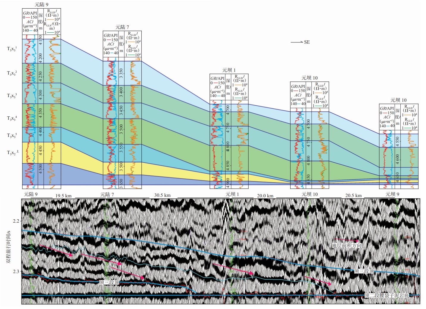下载原图 图 2 过元陆9井—元坝9井地层对比图(a)与地震剖面图(b)(剖面位置见图 1) Fig. 2 Strata correlation(a)and seismic profile(b)across Yuanlu 9-Yuanba 9 well |