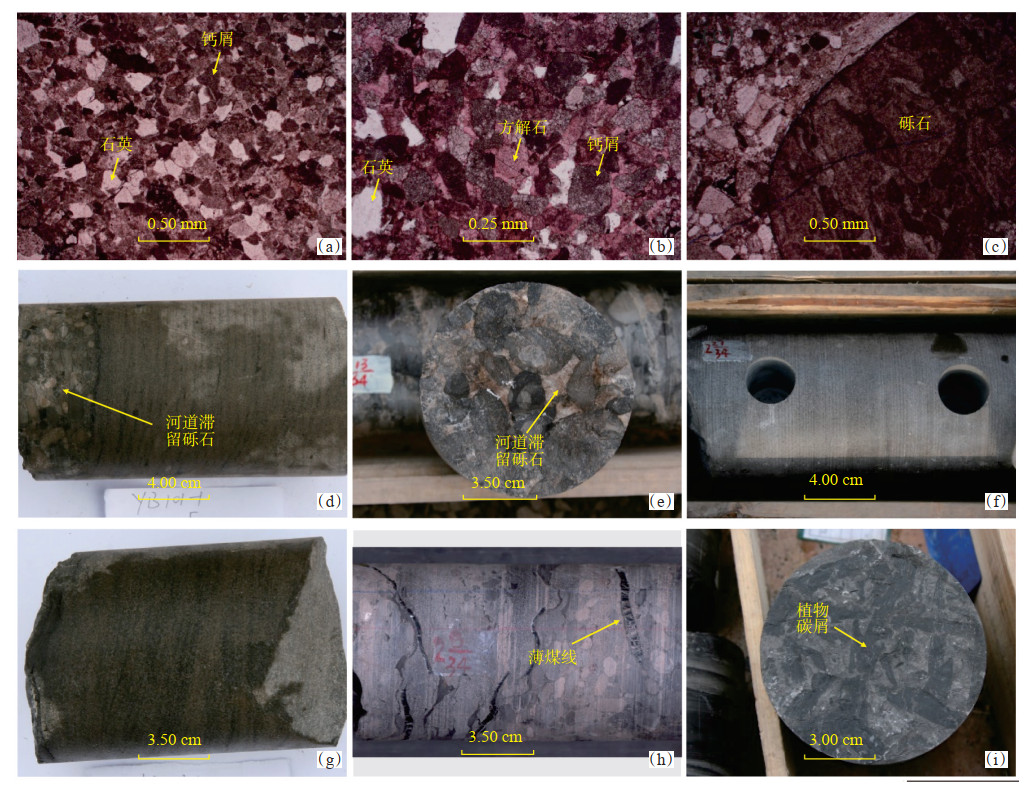 下载原图 图 3 元坝地区须三段部分样品岩石薄片和岩心照片 (a)以碳酸盐岩岩屑为主的钙屑砂岩,石英颗粒分散分布,元坝101井,T3x32,4 833.10 m,单偏光,普通薄片;(b)部分钙屑砂岩中可见方解石胶结物,元陆12井,T3x33,4 314.50 m,单偏光,染色普通薄片;(c)碳酸盐岩砾,元坝101-1井,T3x32,4 823.62 m,单偏光,普通薄片;(d)冲刷面河道滞留沉积物,元坝702井,T3x32,4 443.60 m;(e)砾岩支撑,可见砾间方解石胶结,元陆702井,T3x34,4 446.80 m;(f)块状钙屑砂岩,元坝101-1井,T3x32,4 826.00 m;(g)钙屑砂岩槽状交错层理,元坝101井,T3x32,4 823.00 m;(h)砂岩中碳屑及煤线较发育,元坝101-1井,T3x32,4 831.00 m;(i)岩心断面可见植物碳屑,元陆702井,T3x34,4 451.00 m Fig. 3 Thin section and core photos of some samples from the third member of Xujiahe Formation in Yuanba area |