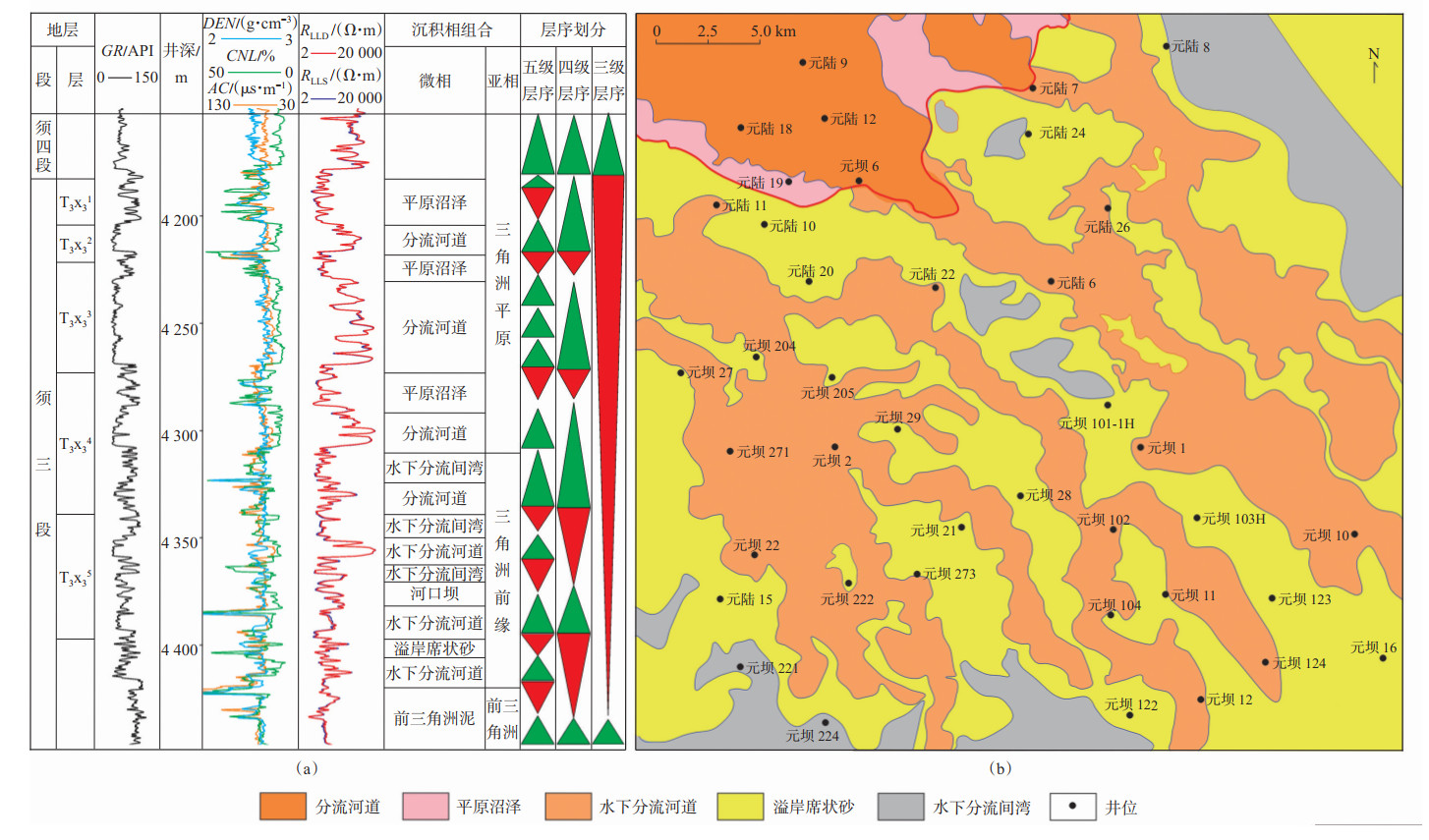 下载原图 图 4 元坝6井须三段单井沉积相划分(a)、沉积相图(b)展布特征 Fig. 4 Sedimentary facies division(a)and distribution(b)of the third member of Xujiahe Formation in Yuanba 6 well |