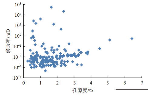 川东北元坝地区须三段的岩石类型包括砾岩、砂砾岩、钙屑砂岩、粉砂岩等。对元坝地区须三段气藏10口取心井156块岩心实测孔隙度、渗透率进行详细地统计、分析,结果显示,孔隙度为0.19%~ 6.42%,平均值为1.93%,表明储层物性较差,孔隙度> 2% 的样品仅占43.6%(图 5)。渗透率为0.001~ 533.580 mD,变化范围较大,平均值5.74 mD,但渗透率 < 0.1 mD的样品可达总数的88.7%(图 5),为典型特低孔-致密的储集岩特征。中细粒钙屑砂岩和砂砾岩物性相对较好,孔隙度平均值分别为2.64% 和1.98%。砂砾岩渗透率较其他岩性明显升高1~ 2个数量级,应该为微裂缝的影响。