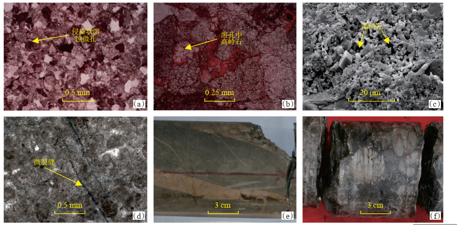 研究区须三段气藏主要的储集空间类型包括:①侵染状粒间-粒内溶蚀微孔。孔隙直径多低于0.05 mm,多呈侵染状分布于(含砾)钙屑砂岩的粒内,少部分发育于钙屑颗粒的粒间[图 6(a)],约占总孔隙体积的25%~35%,多分布在(水下)分流河道钙屑砂岩沉积的中上部,为较差储层的重要储集类型。②粒间溶孔。非选择性溶蚀明显切割了砂屑颗粒,孔隙直径介于0.01~0.50 mm[图 6(b)],约占总孔隙空间的20%~30%,多在物性好的储集岩中发育。在测井曲线上,密度曲线突然降低,声波时差加大,计算的三孔隙度曲线差异明显,通常分布于(水下)分流河道钙屑砂岩沉积的中下部。③黏土矿物及白云石晶间(溶)孔。在一些钙屑砂岩粒间溶孔充填的自生高岭石晶体之间常发育黏土矿物孔隙[图 6(b)],少部分存在于伊利石黏土矿物中,约占总孔隙体积的15%~20%,通常分布于(水下)分流河道中部的中等物性储层内,尽管这部分孔隙类型相对前2种孔隙类型少,但在以碳酸盐岩成分为主的岩性中,自生高岭石黏土矿物的存在一定程度指示了酸性流体(特别是有机酸)溶蚀作用的发生[32-37];粉晶白云石晶间孔,大小相对均匀,部分经酸性流体后期溶蚀扩大,形成大小不等的晶间溶孔[图 6(c)],孔径介于0.01~0.05 mm,这种类型孔隙相对较少,仅在少部分白云岩岩屑中发育,约占总孔隙空间的5%。④(微)裂缝。裂缝以低角度斜交缝(倾角 < 45°)为主,占所观察裂缝总数的80% 左右;高角度斜交缝(倾角> 45°)相对较少。有效裂缝(未充填或半充填裂缝)与全充填裂缝数大致相当,裂缝有效率约为50%。微裂缝常发育于砾石边缘,少部分发育于砾石内部,因此在砂砾岩及砾岩中较发育[图 6(d)—(f)],为砂砾岩储层的重要储集空间类型,也可见部分微裂缝切割砾石。(微)裂缝在钙屑砂岩中较发育,常与薄煤层伴生,有效裂缝面孔率通常低于0.5%,约占总孔隙空间的5%~ 10%,(微)裂缝的存在可明显提高样品的渗透率。⑤溶洞。岩心上以孤立溶洞出现,仅局部发育,孔径通常 < 1.5 cm,< 总孔隙体积的5%,为次要的储集空间类型。