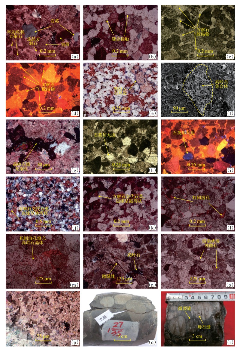 (4) 溶蚀作用。根据溶蚀流体性质以及溶蚀孔隙边缘特征,可以看出,本区溶蚀作用以非选择性埋藏溶蚀为主,而(准)同生期溶蚀作用基本不发育。表现在溶蚀作用切割颗粒或基质特征明显,或沿成岩中晚期微裂缝发育[图 7(l)—(n)],而选择性(准)同生期溶蚀不发育。部分埋藏非选择溶蚀孔隙是对(准)同生期或埋藏早期的粒间孔隙的进一步溶蚀,因为这部分孔隙边缘,早期方解石胶结物也被溶蚀,这部分孔隙约占总溶蚀孔隙的20%~ 30%。一些埋藏溶蚀孔隙则以长石或岩屑颗粒粒内溶孔或铸模孔的形式出现,或者以侵染状微溶蚀孔隙出现[图 7(o)—(p)],这部分孔隙约占总溶蚀孔隙的25%~5%,研究区大部分地区以这种孔隙类型为主。薄片观察结果显示,现今长石体积分数通常低于岩石矿物组成的5%,因此,也可能是部分被溶蚀的结果。