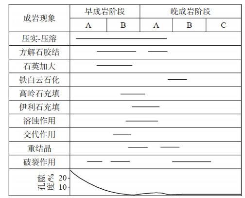 根据以上各个成岩类型的先后顺序判断,结合自生矿物间的相互切割、交代关系[44-45],元坝地区须三段的成岩序列及孔隙的演化规律如图 8所示。可以看出,对储层发育具有重要建设性成岩作用主要为溶蚀作用,破裂作用产生的(微)裂缝对储层质量,无论是对储层储集空间的增加,还是渗透性的改善都具有重要的积极意义。