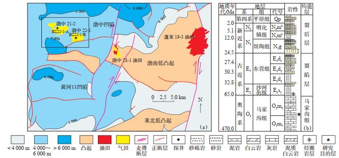 1 区域地质概况渤中21-22构造区位于渤海海域渤中凹陷南部斜坡带,构造位置处于渤中凹陷与渤南低凸起之间,其南部以断层与渤南低凸起相邻,东部受郯庐断裂带分割,分别与渤中28-1油田(下古生界潜山油田)与蓬莱19-3油田相邻,油气成藏条件十分有利[图 1(a)]。渤中凹陷新生代经历了古近纪裂陷期与新近纪坳陷期。裂陷期层序包括沙河街组与东营组,其中沙河街组与东营组三段主要为湖湘泥岩,也是研究区重要的气源岩[17-19];坳陷期层序包括馆陶组、明化镇组与平原组,以河流相沉积为主。研究区新生界直接披覆于下古生界马家沟组之上,具有近源成藏的特征。马家沟组分为上马家沟组以及下马家沟组,其中上马家沟组顶部受加里东期—喜山期多期构造运动影响,发育区域性不整合面。上马家沟组下段以泥岩与泥质白云岩互层为主,上段以厚层灰岩为主;下马家沟组下段主要为泥岩与白云岩互层,上段主要为灰岩,泥质白云质等[图 1(b)]。渤中21-2构造与渤中22-1构造在奥陶系潜山中测试均获得了高产气流,展示了研究区良好的勘探潜力。2口科探井丰富的岩心、薄片、常规测井、自然伽马能谱资料以及成像测井资料,为研究工作提供了详实的资料基础。