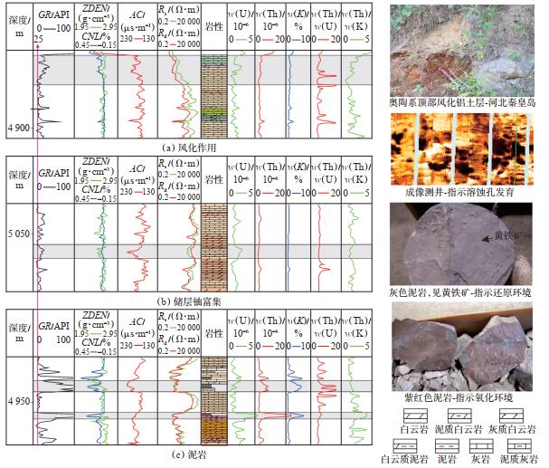 风化成因的高自然伽马与储层中铀元素富集成因的高自然伽马异常一般小于50 API,这与沉积成因的高自然伽马(一般在100 API以上)具有明显的差异。风化成因的高自然伽马[图 2(a),表 1]往往紧邻马家沟组顶部风化壳发育,与碳酸盐岩风化淋滤形成的铝土层有关。储层中铀元素富集形成的高自然伽马异常多发育于内幕储层段,是储层中铀元素在相对还原条件下局部富集而形成的自然伽马正异常[图 2(b),表 1]。风化成因的伽马异常曲线呈明显的漏斗形特征,而铀元素富集成因的高自然伽马异常则多呈箱形的特征。正常沉积的泥岩呈典型的高自然伽马、高声波时差、高中子的三高“箱形”特征,自然伽马值多高于100 API,电阻率呈现负异常;同为正常沉积的泥岩,在自然伽马能谱上U,Th,K均呈现正异常,但Th/U曲线和Th/K曲线特征却有明显的差别,Th/U曲线无规律性的变化,而Th/K曲线一类表现为高值,而另一类则表现为低值[图 2(c),表 1]。