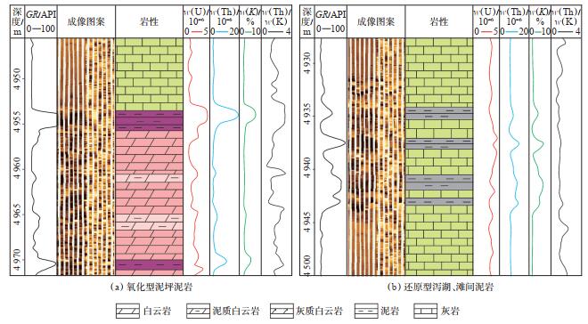 综合泥岩与围岩沉积相分析发现,具有高Th/K值的泥岩往往与白云岩共生,以紫红色为主,为泥坪环境产物,代表氧化成因[图 2,3(a)],而具有较低Th/K值的泥岩则往往与厚层泥晶灰岩相伴生,以灰色、黑灰色为主,且泥岩层面上见黄铁矿,表明其形成于相对(泻湖相,滩间亚相等)还原的沉积环境[图 2,3(b)],与沉积水体的加深有关。