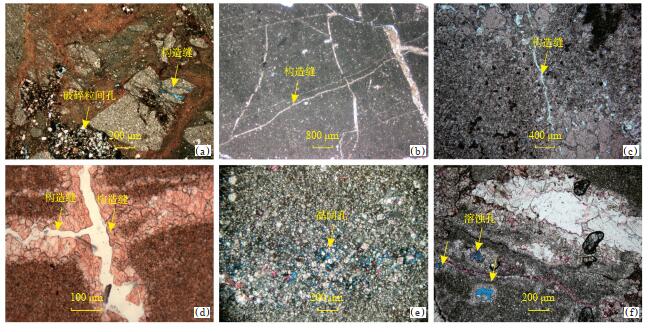 渤海海域渤中21-22构造区主要发育与构造活动相关以及与成岩作用相关的2类储层。与构造活动相关的储层主要为构造裂缝以及破碎粒间孔[图 5(a)]。薄片中可见大量的网状裂缝,多由不同时期的裂缝切割而成[图 5(b)];部分裂缝现今仍然具有开启的特征[图 5(c)],同时大量裂缝在现今已被方解石充填,导致其有效性明显降低[图 5(d)]。基于薄片观察发现,裂缝型储层在各类岩性中均可发育,表明其主要受控于构造应力。与成岩作用有关的储层主要发育在白云岩中。一类为白云岩晶间孔,多与白云岩化的增孔效应有关[图 5(e)],另一类储层为组构选择性溶蚀孔,主要发育于颗粒滩、生屑滩等滩相沉积中,这种选择性溶蚀既有对颗粒的选择性溶蚀,也有对胶结物的选择性溶蚀,其中对颗粒的选择性溶蚀多与同生期—准同生期岩溶有关[图 5(f)]。