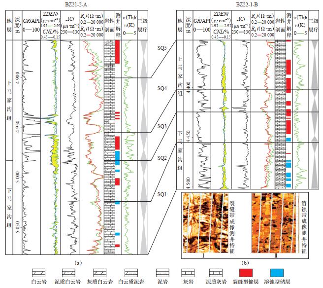 基于成像测井,对2口探井的储层类型及垂向展布进行了刻画(图 6)。裂缝型储层在成像测井上多表现为暗色的正弦曲线,表明裂缝具有低阻特征,未发生充填,为有效裂缝[图 6(b-Ⅰ)];将组构选择性溶蚀型储层以及白云岩晶间孔型储层统称为孔洞型储层,其在成像测井上具有暗色豆状的成像特征[图 6(b-Ⅱ)]。