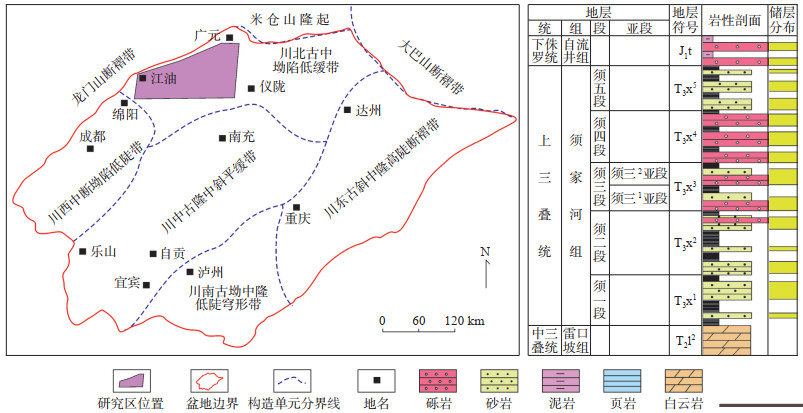 1 地质背景研究区位于四川盆地川北古中坳陷低缓带的西部,地处米仓山隆起以南和川中古隆中斜平缓带以北。行政区划上,北抵广元,南至绵阳(图 1),面积约为1.9万km2。上三叠统须家河组与下部的中三叠统雷口坡组和上部的下侏罗统自流井组均呈不整合接触,由下至上可分为须一段—须五段[12],根据岩性组合特征,须三段可进一步细分为须三1亚段和须三2亚段,岩性以砾岩、砂岩和泥页岩互层为主,储集岩主要为砂砾岩。