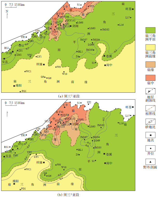 四川盆地西北部须三段广泛发育冲积扇和扇三角洲沉积,可识别出扇中、扇缘、扇三角洲平原和扇三角洲前缘等沉积亚相(表 1)。根据砂砾岩厚度与地层厚度的比值,结合区域地质背景[13],应用优势相编图方法[14-15],分别绘制了须三1亚段和须三2亚段的沉积相平面分布图(图 2)。须三1亚段以发育冲积扇—扇三角洲沉积体系为特色,扇中位于西北部的剑阁以西地区,扇缘向南延伸,至安县、苍溪等地区发育扇三角洲平原,梓潼、阆中以南地区为扇三角洲前缘[图 2(a)]。须三2亚段的沉积基本继承了须三1亚段的沉积格局,发育冲积扇—扇三角洲沉积体系,冲积扇的分布面积较须三1亚段有所扩大,扇中位于西北部的剑阁以西地区,向南延伸,至剑阁等区域为扇缘,梓潼以北地区发育扇三角洲平原,梓潼以南、绵阳等地区为扇三角洲前缘[图 2(b)]。扇中和扇缘中的辫状河道、漫流微相砂砾岩与洪泛平原泥质沉积物呈相互交错分布,向扇三角洲平原、扇三角洲前缘方向有一定的延伸,而砂质辫状分流河道以及泥质为主的分流间平原、水下分流河道与水下分流间湾呈长带状间互分布(图 3)。由于龙门山北段的持续抬升,沉积盆地被大量注入近源物质,同时秦岭、大巴山也有较多的远源物质被搬运至盆地[16],须三段沉积期的物源方向主要为北西—南东向,岩性主要为砂砾岩,砾石成分包括碳酸盐晶粒、碳酸盐颗粒、石英、长石和岩屑。