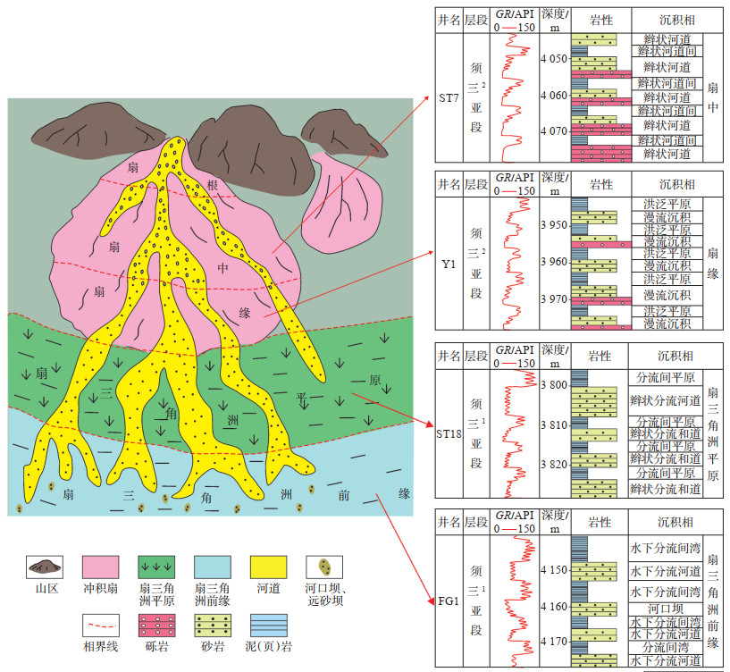 四川盆地西北部须三段冲积扇以发育扇中和扇缘亚相为主,未发现扇根亚相。砂砾岩主要分布于扇中辫状河道微相和扇缘漫流沉积微相。