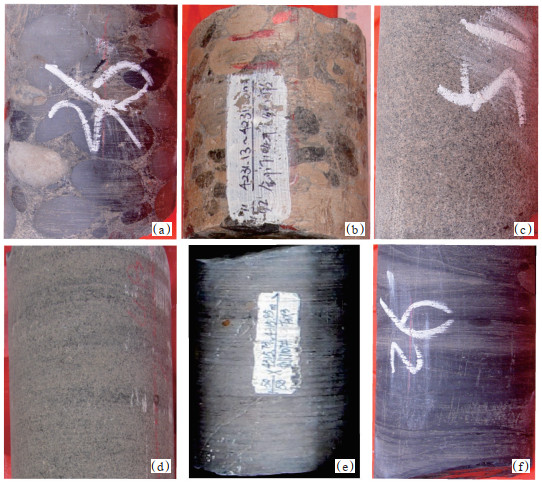 下载原图 图 4 四川盆地西北部须三段砂砾岩的岩心照片 (a)JM105井,4 115.29 m,褐灰色块状碳酸盐质中砾岩;(b)JM104井,4 213.13 m,浅褐灰色块状碳酸盐质细砾岩;(c)JM107井,4 312.56 m,浅灰色中粒长石岩屑砂岩,发育块状层理;(d)JM105井,4 121.71 m,浅灰色细粒岩屑长石砂岩,见板状交错层理;(e)JM107井,4 315.73 m,浅黑灰色细粒岩屑长石砂岩,见平行层理;(f)Z46井,2 793.14 m,黑灰色粉砂岩,见沙纹交错层理 Fig. 4 Core photographs of sandy conglomerates of Xu-3 member in northwestern Sichuan Basin |