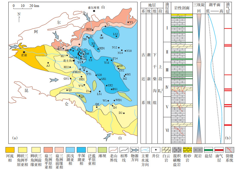 1 地质概况新生代以来,印度板块向欧亚大陆俯冲碰撞,形成了近南北向的挤压作用,地质学家将其称之为喜马拉雅运动。喜马拉雅运动对我国大陆新生代构造具有重大影响,其直接导致了青藏高原的隆升,进而形成了我国西北地区的气候干旱和荒漠化。柴达木盆地位于青藏高原的阿尔金山、昆仑山和祁连山等三大山系之间,为一高原咸化含油气盆地。英西地区在喜马拉雅运动多期构造活动的影响下形成了现今的构造格局,强烈的构造运动产生了大量断裂系统,不仅为油气运移提供通道,而且裂缝自身也具有一定的储集功能。渐新统早期(E31),英西地区发生湖侵而成为沉积中心,随着湖水面积逐渐扩大,接受沉积的区域也较大,周缘广泛发育辫状三角洲沉积和扇三角洲沉积,渐新世中晚期(E32),湖水面积达到峰值,研究区水体最深,沉积了一套半深湖—深湖相混积岩,此时几乎整个凹陷均接受大面积沉积,之后湖水逐渐变浅,顶部接受了一套细粒碎屑岩沉积。因此,渐新世英西地区一直地处湖相沉积中心[图 1(a)],沉积物粒度较细,岩石矿物组成复杂,主要为碳酸盐和泥质,含陆源碎屑,且现今埋藏较深,储层较为致密。油田生产部门将渐新统E32划分为6个油层组,自上而下分别为Ⅰ,Ⅱ,Ⅲ,Ⅳ,Ⅴ,Ⅵ油层组,在全区具有较好的对比性,其中Ⅰ,Ⅱ,Ⅲ属于盐间油层组,Ⅳ,Ⅴ,Ⅵ属于盐下油层组[图 1(b)]。