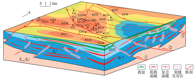 通过对英西地区渐新统E32油气成藏条件的分析,总结了研究区湖相碳酸盐岩成藏模式(图 10):①英西凹陷自身具有一定的生油能力,生油岩虽然丰度不高,质量中等,但具有两大优势,一为咸化环境可以起到催化作用,二为岩石中含大量可溶有机质。②研究区储集层物性较差,但白云石化作用可形成晶间孔,且异常高压和构造运动在研究区形成了大量微裂缝,均可作为储集空间,“连续型”非常规油气藏储集体规模大,可以有效弥补储集体物性较差的缺陷,依然可以形成储量规模巨大的油气聚集区。③研究区渐新统E32的Ⅰ,Ⅱ,Ⅲ等盐间油层组发育累计厚度达数十米的岩盐层和石膏层,可以起到良好的封盖作用。④研究区受晚喜马拉雅运动的影响,构造裂缝十分发育,对油气的二次运移和聚集、次生油气藏的形成均具有重要影响,裂缝在油气输导体系中发挥着巨大作用,利于油气垂向运聚成藏;层间缝的发育利于油气横向运聚成藏。④烃源岩在生、排烃过程中产生的异常高压是研究区油气运移的主要驱动力,存在“超压+ 浮力”驱动和“超压+扩散”驱动等类型。⑥研究区多期次持续充注和晚期成藏特征有利于油气选择优势区聚集,这些成藏要素在时间和空间上的有机耦合促进了英西亿吨级大型油气藏的形成。