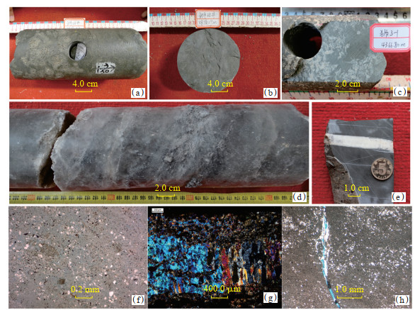 通过对英西地区渐新统主要储集岩进行岩心观察和薄片鉴定可以得出,研究区的岩石以深灰色—灰色为主,泥晶结构,岩心上肉眼可见石盐和石膏等盐类矿物,部分沉积成层,部分以分散状矿物附存于岩石中[图 2(a)—(e)],铸体薄片在偏光显微镜下可见蓝色铸体呈弥散状分布,难以见到大孔,偶见裂缝,石膏在正交偏光下可见黄绿等高级干涉色[图 2(f)—(h)]。岩石粉末样品的X射线衍射全岩矿物含量分析结果显示,盐间地层和盐下地层均以泥晶碳酸盐岩为主,部分微小层含砂或含泥较多,可能造成分析结果为砂岩或泥岩,与取样位置紧密相关。岩石的主要矿物组成存在较大差异(表 1),如果统计样品数足够多,可以得出盐间地层的盐类矿物含量要高于盐下地层,盐下地层的碳酸盐矿物含量要高于盐间地层。表 1仅列出部分样品的矿物组成,其统计结果显示,盐间地层碳酸盐平均质量分数为40.6%,泥质平均质量分数为17.9%,陆源碎屑平均质量分数为29.6%,其它矿物平均质量分数为11.9%;盐下地层碳酸盐平均质量分数为49.0%,泥质平均质量分数为15.7%,陆源碎屑平均质量分数为21.7%,其它矿物平均质量分数约为13.7%。盐间地层发育较多具有一定厚度的成层性的岩盐和膏岩,因其为非储层,在储层分析取样过程中予以了回避,可以推测盐间地层沉积期湖水蒸发作用较强,水体逐渐变浅,陆源碎屑供给更充足,且水体中携带的矿物质更丰富。