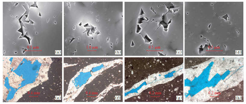 3 储层物性与储集空间类型英西地区287个岩心样品的物性分析结果显示,孔隙度多为2%~8%,平均为4.6%(图 3);渗透率多为0.01~0.10 mD,平均为0.09 mD,由于部分样品含裂缝、渗透率值较高,使得平均值被拉大而不具有参考价值。按照国家能源局公布的行业标准SY/T 6285—2011《油气储层评价方法》[15],可将研究区的储层划归为“低孔—特低渗”级别。整体上岩心较致密,岩心观察时,极易将钻井过程中泥浆溶蚀岩心表面的盐类矿物而形成的针孔状孔隙误认为地质条件下形成的溶蚀孔,剖开新鲜断面未见类似表面的溶孔,通过对岩心注入带颜色(如蓝色)的环氧树脂后干磨制片,然后放置到偏光显微镜下进行鉴定,可以看出弥散状的微孔隙广泛分布,甚至超过显微镜的分辨率而难以识别,仅能隐隐约约看见呈片分布的蓝色物质,场发射扫描电镜下可以清晰地观察到三角形、锯齿状等孔隙,孔隙直径多小于1 μm,这类孔径极小但数量巨大的白云石晶间孔为研究区储集岩的主要储集空间[图 4(a)—(d)]。另一类储集空间类型为裂缝,按照成因可分为层间缝和构造裂缝[图 4(e)—(h)],前者为沉积时矿物的分异所致,后者为异常高压造缝或构造应力作用形成。湖相碳酸盐岩中形成水平或者平行层理是非常普遍的,砂、泥和碳酸盐互层,有的甚至形成页理状,因研究区目的层自身具有生油功能,层间缝中普遍含油,与构造作用等其他因素形成的垂直或斜交层理缝共同组成了网状裂缝系统,为油气输导到低势区提供了三维空间通道。部分岩石薄片中可见与裂缝连通处的孔隙更发育,孔径更大,单偏光下可见黑色残留的石油,整体上溶蚀作用较微弱,仅在裂缝周缘进行轻微扩容。