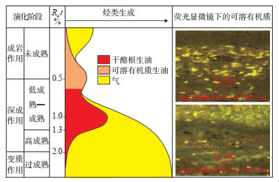 英西地区咸化湖盆沉积的湖相碳酸盐岩和泥岩均具有一定的生烃能力,因混积原因造成其总有机碳含量不高,TOC质量分数多为0.5%~1.0%,有机质类型多以“中等—差”级别为主,且成熟度较低,以未熟—低熟为主,其镜质体反射率Ro值多为0.53%~0.89%。但咸化环境对生烃机理具有重要影响[21-22],咸化湖盆烃源岩具有典型的“双峰式”生烃模式,可在未成熟阶段生产生物气、低成熟阶段在催化作用下生产低熟油(图 8),且英西地区渐新统E32岩石中存在大量分散可溶有机质,也可在低熟阶段大量生、排烃,据部分样品分析结果发现,可溶有机质约占总有机碳的18%,且具有较高的液态烃转化率,其裂解所需的活化能更低,可在较低温度即达到较高产烃率。