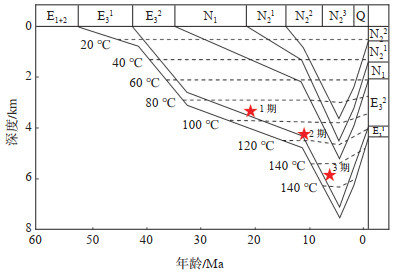 英西地区渐新统E32湖相碳酸盐岩储层中的含烃盐水包裹体测试结果显示,均一温度呈多峰式分布,可判断出3期油气充注史(图 9):①第1期充注发生于N21,对应的均一温度多为90~100 ℃;②第2期充注发生于N22,对应的均一温度多为110~ 120 ℃;③第3期充注发生于N23,对应的均一温度多为140~150 ℃。除这些峰值区间外,少量均一温度数据在其他区间也具有连续分布特征,表明其油气充注具有“以3期主力充注为主、多期持续充注为辅”的特征。综上所述,英西地区渐新统E32主力烃源岩于N21(19 Ma)进入生烃门限,N22(15.5~10 Ma)达到主力生、排烃期,N23(7.5 Ma)进入尾声,为相对较长的生、排烃过程,这类持续生烃、多期持续充注的特征是自生自储型油气藏形成的基础。