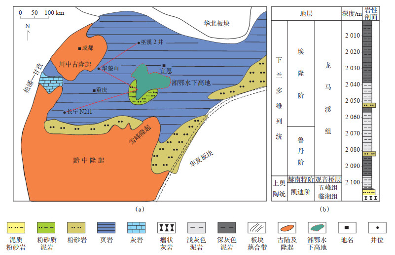 1 地质概况晚奥陶世—早志留世,中上扬子地区受康滇古陆、黔中古隆起、川中古隆起和雪峰古隆起包围,形成了向北东向开口的浅海沉积的古地理格局[11-13]。研究区位于上扬子地台中部的湘鄂水下高地的西南缘(图 1),目标井XY-3五峰组深度为2 106.0~2 096.0 m,厚度为10.0 m,观音桥层段位于2101.1~2096.0 m,厚度为4.1 m,其中2 106.0~2 104.0 m处的岩性为灰色泥质粉砂岩,底部与临湘组瘤状灰岩为分界,2 104.0~2 096.0 m处的岩性为深灰色泥岩,部分岩心可见薄层状粉砂岩夹层,并在岩心表面见少许的笔石化石。龙马溪组位于2 096.0~2 084.0 m处,岩性主要为灰黑色泥岩,岩心表面可见黄铁矿集合体。2 084.0~2 039.0 m处岩性为灰色泥岩,笔石化石呈无序叠加态分布。2 039.0~2 002.2 m处岩性为深灰色泥岩。