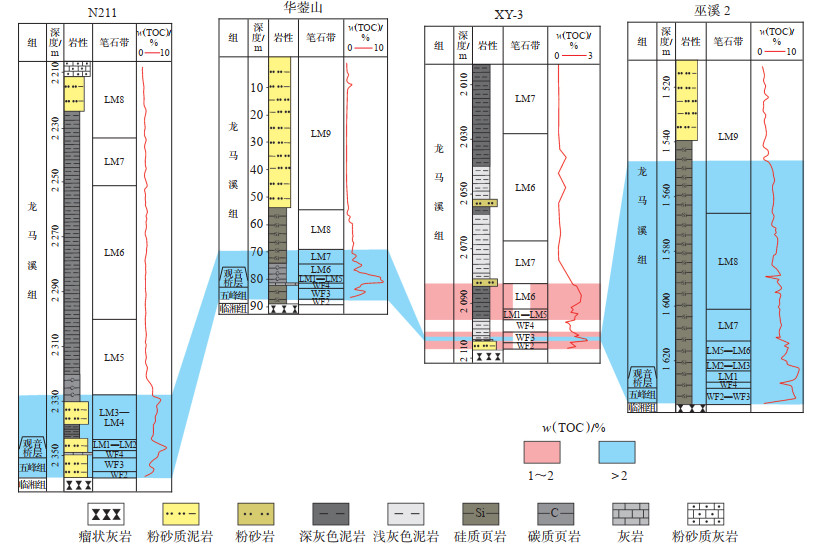 4 勘探意义上扬子地区上奥陶统五峰组—下兰多维列统龙马溪组笔石生物地层特征在长宁、华蓥山、巫溪等地区的研究较为深入。选择具有代表性的长宁N211井、华蓥山、巫溪2井等钻井,揭露其五峰组—龙马溪组富有机质页岩的有机质丰度、矿物组成、沉积环境等,并与湘西北地区的XY-3井进行对比。XY-3井五峰组—龙马溪组发育WF2—LM7笔石带,缺失LM1笔石带。有机质相对富集的层段为WF2—WF3和LM2—LM4,厚度为17.9 m,岩性以硅质页岩为主,具有高脆性、相对高孔隙度的特征,沉积于偏氧化环境,TOC质量分数平均为1.41%。