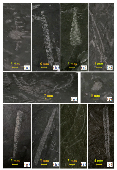 下载原图 图 3 湘西北XY-3井五峰组-龙马溪组典型笔石图版 Fig. 3 Typical graptolite plate of Wufeng-Longmaxi Formation in well XY-3 in northwestern Hunan (a)Demirastrites decipiens, LM6, 2 067.0 m; (b)Glyptograptus x, LM2, 2 094.3 m; (c)Cystograptus vesiculousus, LM4, 2 092.4 m; (d)Streptograptus Yin, LM6, 2 065.2 m; (e)Rastries leiboensis Ye, LM7, 2 027.5 m; (f)Petalolithus minor Elles, LM5, 2 079.6 m; (g)Appendispinograptus supernus, WF3, 2 101.6 m; (h)Normalogr extraordinarius, WF4, 2 099.4 m; (i)Dicellograptus tumidus chen, WF2, 2 105.6 m; (j)Akidograptus ascensus, LM2, 2 095.4 m |