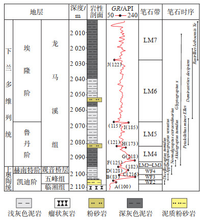 研究区XY-3井2 082.0 m处可见少量笔石,笔石体形状呈花瓣式,为典型的花瓣笔石Petalolithus minor Elles[图 3(f)],该笔石首次出现在LM5,可作为LM5底界的判定标志。在测井曲线上GR值整体波动较小,局部极大值I峰为185 API,与临近低峰105 API之间的半幅值处对应的深度为2 067.0 m,为LM5的顶界,也是LM6的底界。