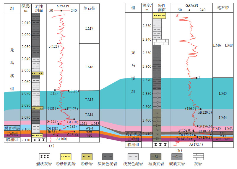 将湘西北XY-3井与焦石坝地区标准井JY-1进行对比,可以得出二者在笔石特征及自然伽马曲线特征上均较吻合(图 5)。自然伽马测井曲线上WF2,WF3处于高值峰,LM2—LM3处于低值峰,LM4,LM5处于高值峰,但与焦石坝地区JY1相比,研究区XY-3井的自然伽马曲线上GR值普遍偏低,JY-1井位于焦石坝西北部,其WF2—LM4主要为黑色炭质页岩,硅质含量高,含丰富的笔石化石[19-20]。焦石坝地区五峰组—龙马溪组呈完整的连续沉积,富有机质页岩沉积厚度大,导致JY1井测井曲线上GR值相对较高。LM1笔石带测井曲线上一般表现为GR值具有局部较大峰的特征[10](E峰GR值达307.4 API)。受广西运动的影响,湘鄂水下高地发生隆升,造成研究区五峰—龙马溪组沉积时水体变浅,有机质含量较低,测井曲线上GR值整体偏低。LM1沉积时期研究区出露水面,导致缺失LM1及局部极大E峰。