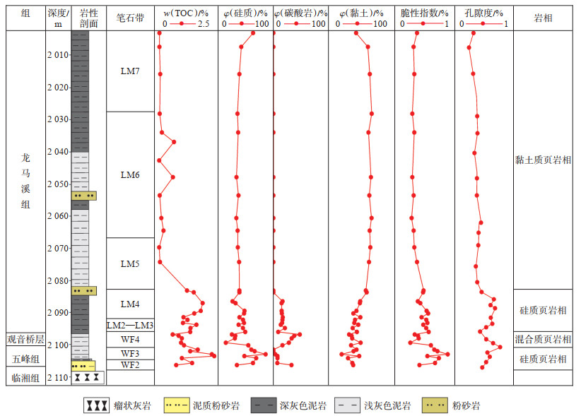 通过硅质矿物(石英+ 长石)、碳酸盐矿物、黏土矿物等3端元图解可以对湘西北地区各笔石带页岩矿物质量分数进行岩性分类[21],并进一步评价各笔石带有机质丰度特征,可将其划分为低碳(<1.0%)、中碳(1.0%~2.0%)、高碳(2.0%~4.0%)、富碳(>4.0%)等4个级别[22]。WF2—WF3笔石带的硅质矿物质量分数为45%~88.5%,平均为67.9%,TOC质量分数平均为1.46%,为中碳硅质页岩相。WF4的硅质矿物质量分数为29.5%~62.8%,平均为43.46%,TOC质量分数平均为0.89%,为低碳混合质页岩相。LM2—LM4硅质矿物质量分数为39.4%~58.3%,TOC质量分数平均为1.35%,为中碳硅质页岩相。LM5—LM7硅质矿物质量分数为47.0%~69.9%,平均为49.8%,TOC质量分数平均为0.26%,为低碳黏土质页岩。垂向上从五峰组—龙马溪组的硅质矿物和碳酸盐矿物含量均呈现减小趋势,黏土矿物含量呈增加趋势(图 6)。XY-3井的WF2—WF3,LM2—LM4具有较好的生烃潜力,其有机质丰度相对较好,平均为1.41%,岩性主要为硅质页岩相,硅质矿物平均质量分数为59.8%,脆性指数平均为0.61,相对较高,岩体具有一定的可压裂性,孔隙度平均为1.50%,有利于页岩气富集,可以作为储集层。LM5—LM7直接覆盖在富有机质层段之上,与LM2—LM4呈整合接触,岩性为黏土质页岩相,孔隙度平均为0.75%,岩性致密,具有较好的封盖能力。因WF2—WF3,LM2—LM4具有高TOC、高脆性、高孔隙度特征,且具有一定的生烃潜力和可压裂性,LM5—LM7具有较好的封盖能力,因此研究区XY-3井具有相对较好的生储盖组合(图 7)。