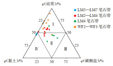 下载原图 图 7 湘西北XY-3井页岩矿物组成的三端元图解 Ⅰ. 硅质页岩相;Ⅱ. 混合质页岩相;Ⅲ. 灰质页岩相;Ⅳ. 黏土质页岩相 Fig. 7 Mineral composition diagram of shale in well XY-3 in northwestern Hunan |