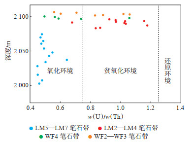 LM2—LM4笔石带的w(U)/w(Th)为0.68~1.17,平均为0.97,指示LM2—LM4沉积于贫氧化环境。岩石中硅质含量较高,TOC质量分数平均为1.35%,岩性为中碳硅质页岩相,并发育双列攀合笔石Akidograptus ascensus、Cystograptus vesiculousus等,笔石枝呈现上攀式生长,胞管排列整齐,反映了沉积水体相对较深,且为贫氧化环境。