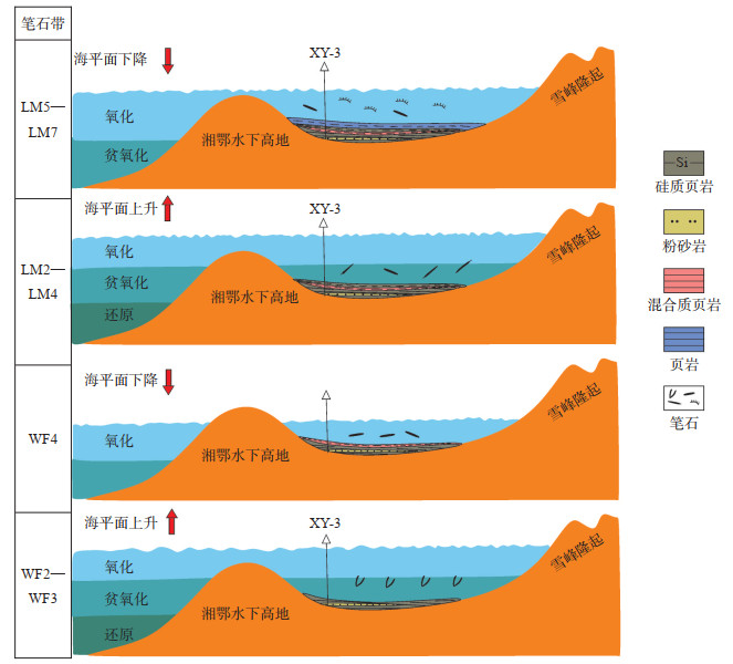 湘西北地区XY-3井的WF2—WF3,LM2—LM4笔石带作为页岩气的有利富集层段,岩性整体上具有高硅-低黏土-较高的TOC含量等特征,但与长宁地区N211井、华蓥山、巫溪2井相比,研究区XY-3井的WF2—WF3,LM2—LM4厚度较薄,富有机质层段的页岩厚度仅为1.2 m。晚奥陶世,研究区受广西运动的影响,湘鄂水下高地发生隆升,沉积水体变浅,地层出露水面并遭受剥蚀,造成其缺失LM1,使富有机质页岩沉积厚度变薄。有机质的富集需要水体保持缺氧状态,以减少有机碳的氧化分解[29],而WF2—WF3,LM2—LM4沉积于含氧环境,不利于有机质的保存,导致其TOC含量偏低。因此,受湘鄂水下高地隆升的影响范围内的五峰组—龙马溪组页岩气勘探存在一定的风险。湘鄂水下古隆起腹部的隆升最为剧烈,缺失的笔石带层更多,其周缘缺失的笔石带相对较少,如彭页1井。尽管彭页1井紧邻湘鄂水下古隆起,但其未在古隆起腹部,仅缺失观音桥层,具有一定的勘探潜力。综上所述,在湘西北地区进行页岩气勘探时,可在湘鄂水下古隆起的周缘或边缘寻找有利目标区。
