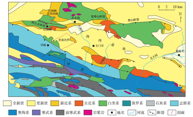 下载原图 图 1 酒西盆地区域地质图与红柳峡岔沟剖面位置 Fig. 1 Regional geological map of Jiuxi Basin and location of Chagou profile in Hongliuxia area |