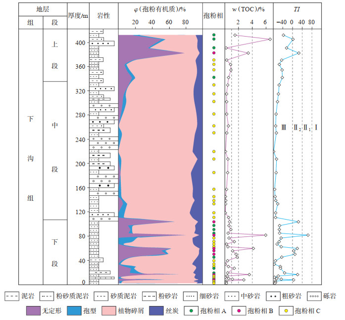 2.5 有机质类型孢粉相分析不仅可以用来判识母质来源和沉积环境,亦可通过孢粉有机质中油倾组分和气倾组分的相对含量来划分有机质类型[18],油倾的孢粉有机质相当于Ⅰ,Ⅱ型干酪根(藻类、藻类来源的无定形和角质层等),气倾的孢粉有机质相当于Ⅲ型干酪根(高等植物来源的无定形、木质及其他维管植物组织等)[22]。因此,在以煤岩显微组分命名为基础而制定的干酪根显微组分分类标准[23]中将有机显微组分划分为腐泥组、壳质组、镜质组和惰质组四大类,通过对每组显微组分的定量统计并加权后求得类型指数TI,进而划分有机质类型。本次研究根据类型指数TI对下沟组进行了有机质类型的划分,结果表明,下沟组烃源岩以Ⅲ型有机质为主(占比为82.0%),Ⅱ2和Ⅱ1型有机质较少(占比分别为16.0% 和2.0%),无Ⅰ型有机质。其中,下沟组下段样品中Ⅲ型、Ⅱ2和Ⅱ1型有机质占比分别为74.1%,22.2% 和3.7%,无Ⅰ型有机质;中段样品有机质类型均为Ⅲ型;上段样品中Ⅲ型和Ⅱ2型占比分别为75.0% 和25.0%。孢粉相分析表明,红柳峡地区岔沟剖面下沟组烃源岩以Ⅲ型有机质为主,其生油潜力整体较差,仅在下段和上段部分层位为较好的Ⅱ2和Ⅱ1型有机质,具有一定的生油潜力。这是因为红柳峡地区在下沟组沉积期靠近湖盆物源区,沉积水体较浅,导致烃源岩发育较差。这与前人对红柳峡剖面的认识基本一致。