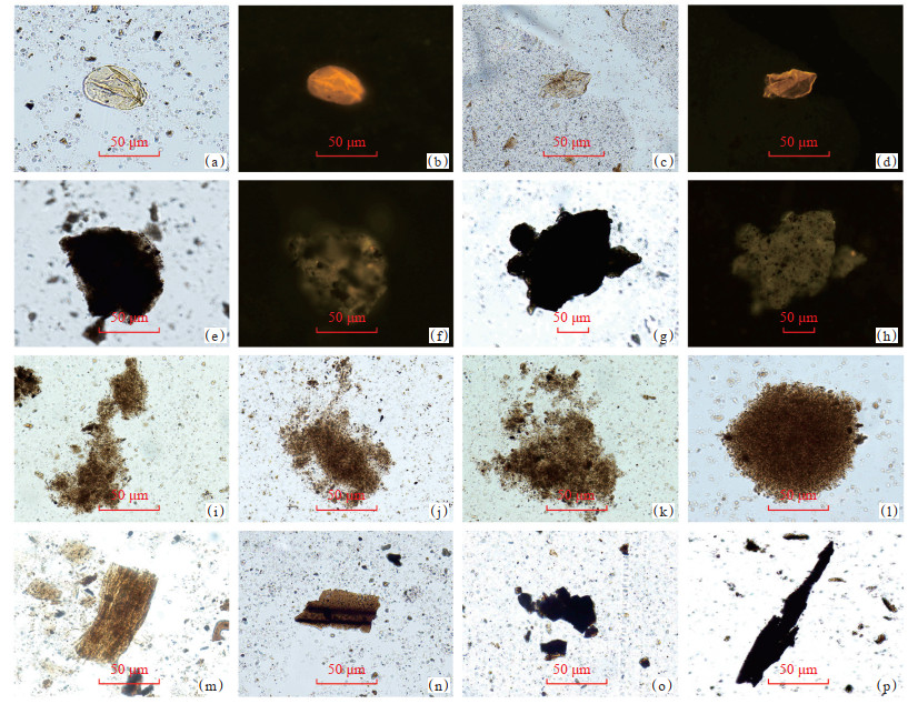 下载原图 图 3 红柳峡地区下沟组孢粉有机质镜下特征 (a)孢粉体,透射光下呈淡黄色,X-12;(b)与(a)为同一视域,孢粉体在蓝光激发下呈橙色荧光;(c)角质体,透射光下呈淡黄色,X-6;(d)为(c)的同一视域,角质体在蓝光激发下呈橙色荧光;(e)凝胶化无定形,透射光下呈深褐色—棕黑色,X-4;(f)为(e)的同一视域,凝胶化无定形在蓝光激发下呈暗黄色荧光;(g)凝胶化无定形,透射光下呈棕黑色,X-27;(h)为(g)的同一视域,凝胶化无定形在蓝光激发下呈暗黄色荧光;(i)—(l)颗粒状无定形,透射光下呈棕色—褐色,蓝光激发下无荧光显示,X-23,X-23,X-23,X-47;(m)棕色木质,透射光下呈棕色,显示半凝胶化结构,蓝光激发下无荧光显示,X-16;(n)棕色木质,透射光下呈棕褐色,蓝光激发下无荧光显示,X-12;(o)黑色木质,透射光下呈黑色,蓝光激发下无荧光显示,X-37;(p)丝炭,透射光下呈黑色,蓝光激发下无荧光显示,X-49 Fig. 3 Microscopic features of palynological organic matter of Xiagou Formation in Hongliuxia area |