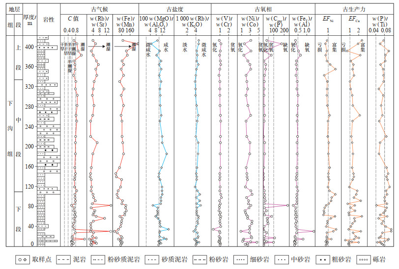Rb离子半径相对较大,通常在风化过程中较稳定,易被黏土矿物吸附,而Sr离子半径较小,在水中溶解度较大,易迁移流失,湿润气候条件下降水较多,风化程度较高,因此在母岩中残留较多Rb,使Rb/Sr值升高,即高Rb/Sr值代表湿润气候,低Rb/Sr值代表干旱气候[34]。下沟组w(Rb)/w(Sr)为1.57~14.89(平均值为4.21),下段、中段和上段的平均值分别为4.41,3.37和5.10,指示下沟组沉积期整体潮湿,晚期具有更加潮湿的趋势(图 4)。