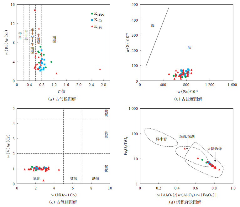 3.2.1 古气候Fe,Mn,V,Ni,Cr和Co等元素在潮湿气候条件下相对富集。干燥气候条件下,由于水分蒸发和水介质碱性的增大使得Ca,Mg,Na,K,Sr和Ba等元素大量析出沉淀,在沉积物中的含量较高[32]。因此可根据这2类元素的相对含量和比值来判断古气候条件,前人据此建立的C值在古气候研究中得到了广泛的应用。