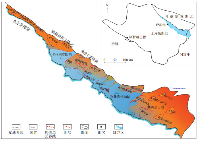 1 地质概况阿姆河盆地是在图兰地台背景上发育起来的中新生代盆地,共经历了二叠纪—三叠纪裂陷期、侏罗纪—古近纪始新世裂后热沉降期和渐新世—新近纪抬升改造3个演化阶段[9]。研究区位于阿姆河盆地东部,现今构造形态呈北西—南东向展布,横跨查尔朱隆起、坚基兹库尔隆起、卡拉别克凹陷、桑迪克雷隆起、别什肯特坳陷、基萨尔山前6个三级构造单元(图 1)。