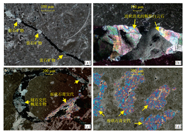 下载原图 图 10 阿姆河盆地东部牛津阶灰岩样品热流体岩石学特征 (a)微亮晶微生物黏结球粒灰岩,萤石充填构造微缝,J-21,3 029.13 m,普通薄片(-);(b)泥晶灰岩,裂缝内由波状消光的粗晶马鞍状白云石充填,基萨尔山前带EHo-22井,2 929.94 m,普通薄片(-);(c)含生物碎屑泥晶灰岩,硅质燧石、硬石膏共生交代生物屑,EHo-22井,3 425.15 m,铸体薄片(+);(d)凝块岩,板状硬石膏交代基质,EHo-22井,3 415.31 m,铸体薄片(+) Fig. 10 Thermal fluid characteristics of Jurassic limestone samples in eastern Amu Darya Basin |