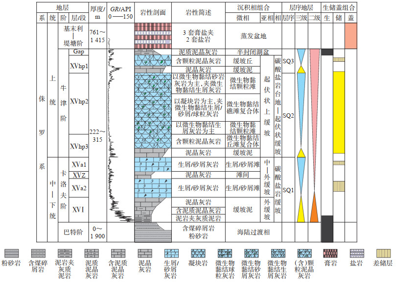 阿姆河盆地在侏罗纪处于稳定沉降背景,卡洛夫—牛津阶随盆地沉降海侵加剧,沉积环境由海陆过渡相过渡到海相环境。根据研究区卡洛夫—牛津阶钻井岩性-岩相组合、测井曲线和地层地震反射特征,共识别出3个三级层序(图 2)。SQ1为海平面长周期上升到下降旋回,海平面上升期发育了由泥岩、泥质灰岩、含泥质泥晶灰岩组合的岩相序列;海平面下降期发育了以生物屑或砂屑灰岩为主的岩相序列。SQ2和SQ3为海平面快速上升到缓慢下降旋回,海平面快速上升期均发育了以灰黑色泥晶灰岩为主的岩相序列;海平面下降期均发育了由微生物岩、微生物黏结砂屑/生屑等颗粒灰岩组合的岩相序列。